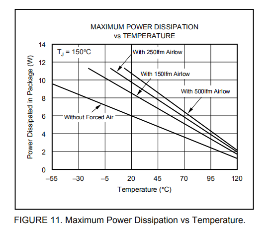 封装中可以安全散热的功率与环境温度和散热器设计有关。PowerPAD封装是专门为提供出色的功耗而设计的,但是电路板布局极大地影响了封装的散热。