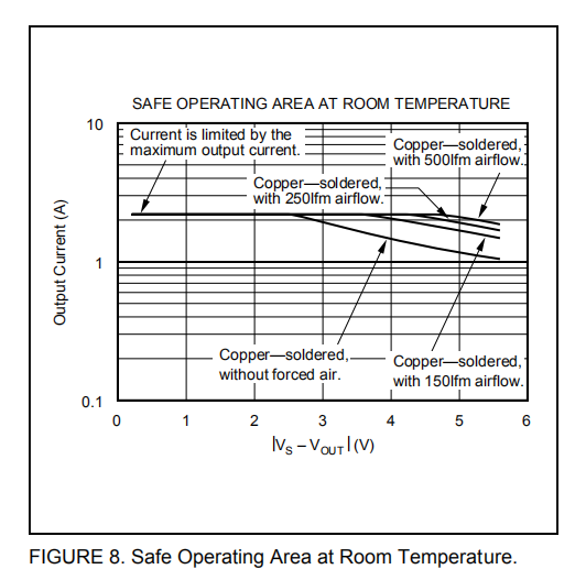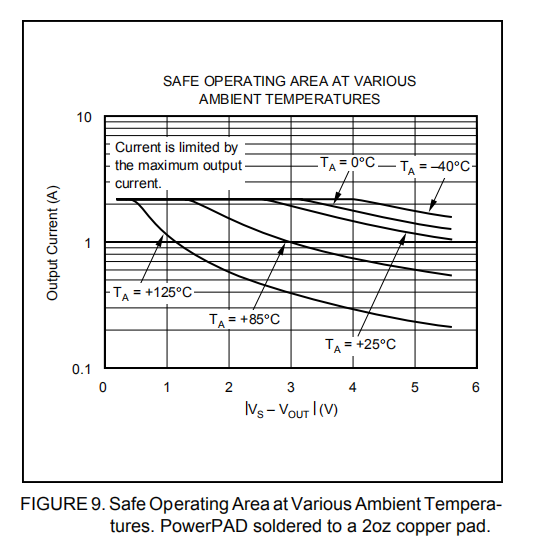图8显示了室温下不同散热力下的安全操作区域。注意,安全输出电流随着(VS–VOUT)的增加而减小。图9显示了不同温度下的安全操作区域,电源板焊接到一个2盎司的铜垫上。