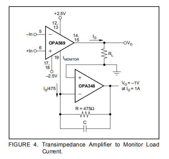 OPA569具有精确的输出电流监视器(IMONITOR)不需要对负载使用串联电阻。这大大提高了效率,并提供了更好的整体摆动供应性能。