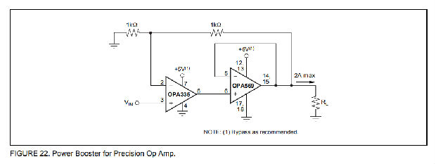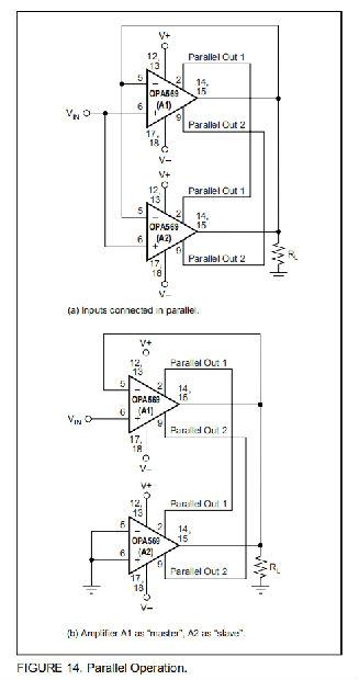 OPA569允许多个运算放大器并联运行,以扩展输出电流能力或改善对轨道的输出电压摆动。特殊的内部电路使负载电流在两个(或更多)运算放大器之间平均分配。