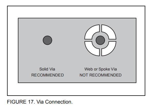 6. 将这些孔布置到地平面时,不要使用典型的腹板或轮辐连接方法,如图17所示。网络连接有一个高热阻连接,有助于减缓焊接过程中的热传递。这使得焊接具有接地平面连接的过孔更加容易。然而,在这种应用中,低热阻是最有效的传热要求。因此,PowerPAD组件下的孔应与内部接地平面连接,并在整个电镀通孔周围进行完整连接。