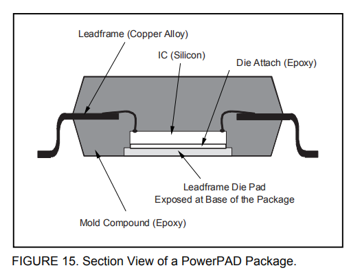 PowerPAD封装的设计使得引线框架模具垫(或热垫)暴露在IC底部,如图15所示。这在模具和封装外部之间提供了极低的热阻(θJC)路径。IC底部的热垫可以直接焊接到PCB上,使用PCB作为散热片。此外,电镀通孔(过孔)为PCB背面提供了一条低热阻热流道。
