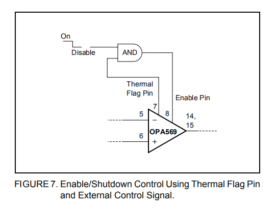 可以将热标志引脚直接连接到自动关机保护的启用引脚上。当需要热关机和放大器启用/禁用功能时,外部生成的控制信号和热标志引脚输出应与与门结合,如图7所示。温度保护设计用于防止过载。这并不是为了取代适当的散热。连续运行OPA569进入和退出热关机将降低可靠性。