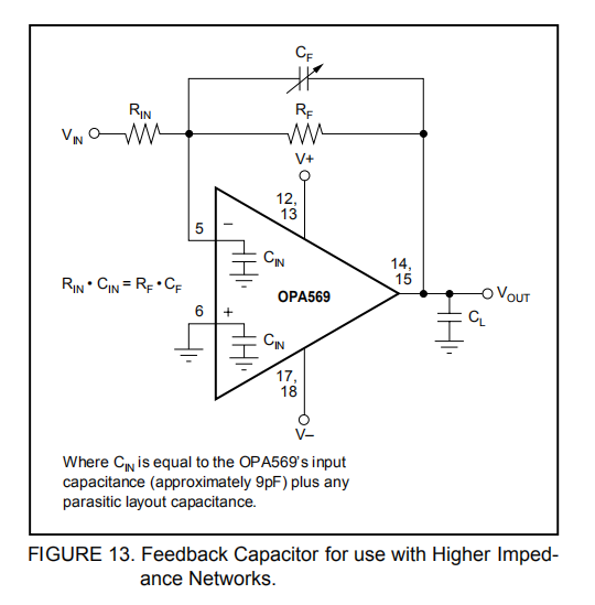 为了获得高阻抗反馈网络(RF>50kΩ)的最佳稳定时间和稳定性,可能需要在反馈电阻RF上添加反馈电容器,如图13所示。该电容器补偿反馈网络阻抗和OPA569输入电容(以及任何寄生布局电容)产生的零点。这种效应在高阻抗网络中变得更加显著。