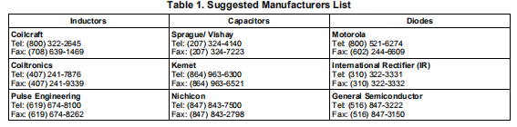 输出二极管应使用肖特基二极管。二极管的正向电流额定值应更高大于输入电流峰值,且反向电压额定值必须高于输出电压。请勿使用普通整流二极管,由于开关速度慢,恢复时间长,造成效率和负载受到监管。表1显示了二极管制造商的列表。