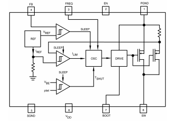 振荡器的开关频率通过选择连接在VIN之间的外部电阻器(R3)来选择还有频率引脚。请参阅的典型性能特征部分中标题为“频率与VIN”的图表选择R3值以获得所需开关频率的数据表。高开关频率允许使用非常小的表面贴装电感器和电容器,并产生非常小的解决方案尺寸。A建议开关频率在300kHz和2MHz之间。