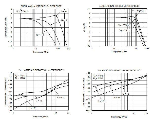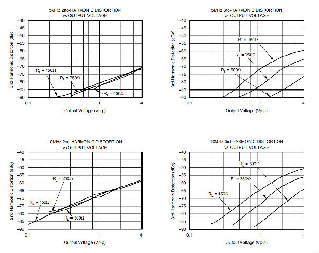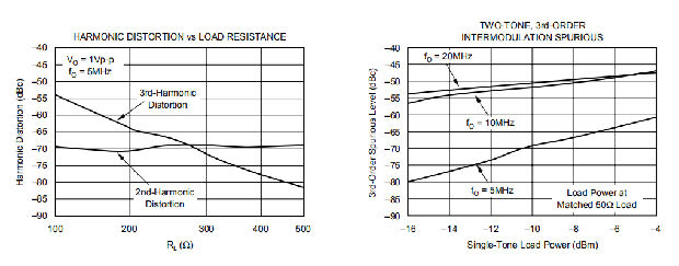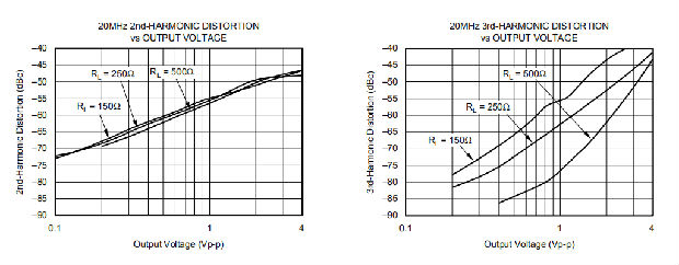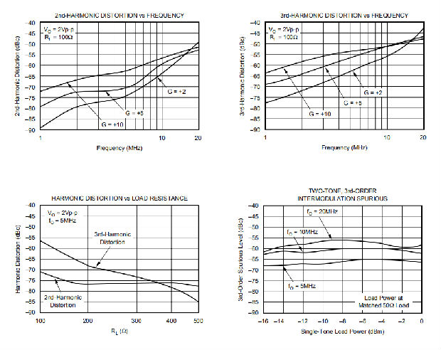 OPA634和OPA635在150Ω负载下具有良好的失真性能。与其他解决方案相比,它在更轻的负载和/或在单+3V电源上运行提供了卓越的性能。一般来说,在基波信号达到非常高的频率或功率水平之前,二次谐波将主导失真,而三次谐波分量可以忽略不计。然后聚焦于二次谐波,增加负载阻抗直接改善失真。请记住,总负载包括反馈网络;在非反向配置(图1)中,这是RF+RG的总和,而在反向配置中,只需将RF与实际载荷。