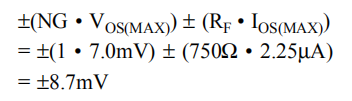 宽带电压反馈运算放大器的平衡输入级允许在各种应用中获得良好的直流输出精度。与同类产品相比,OPA634和OPA635的电源电流微调提供了更严格的控制。尽管高速输入级确实需要相对较高的输入偏置电流(通常每个输入端子25μA),但是它们之间的紧密匹配可以是用于减小由该电流引起的输出直流误差。这是通过匹配出现在两个输入端的直流源电阻来实现的。使用最坏情况+25°C输入偏移电压和电流规格,评估图1的配置(其具有匹配的直流输入电阻),得出最坏情况下的输出偏移电压等于:(NG=直流条件下的非逆变信号增益)