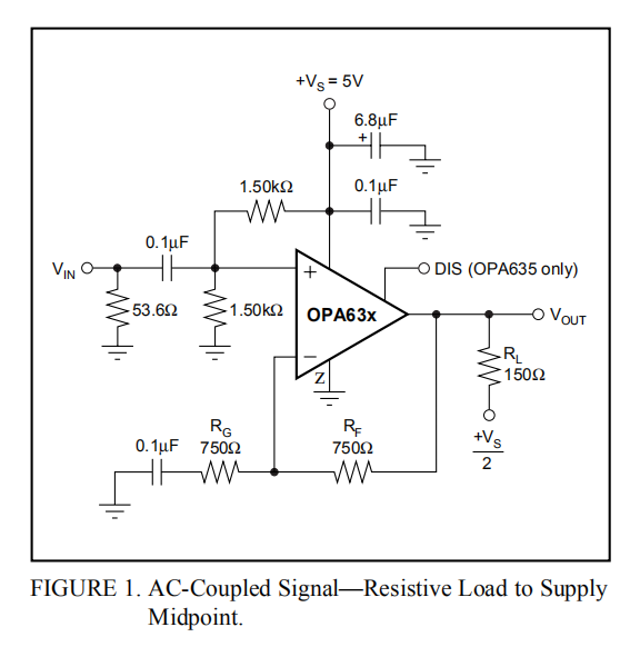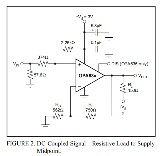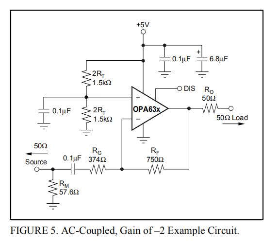 图1显示了用于+5V规格和典型性能曲线的交流耦合+2增益配置。出于测试目的,输入阻抗设置为50Ω,电阻器接地。规范中报告的电压波动直接在输入和输出引脚处测量。对于图1中的电路,高频输出的总有效负载为150Ω| | 1500Ω。禁用管脚需要由低阻抗源驱动,例如CMOS逆变器。非逆变输入端的1.50kΩ电阻器提供共模偏置电压。它们的并联组合等于逆变输入(RF)处的直流电阻,使直流偏移最小化。