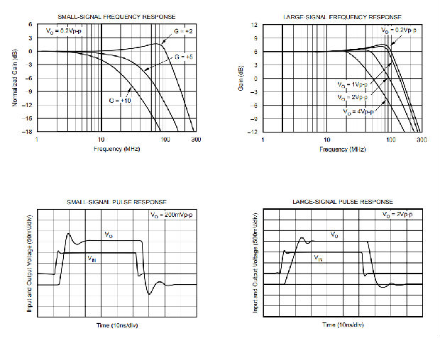 随着信号增益的增加,电压反馈运放的闭环带宽逐渐减小。理论上,这种关系用规范中显示的增益带宽积(GBP)来描述。理想情况下,GBP除以非反转信号增益(也称为噪声增益,或NG)将预测闭环带宽。实际上,这只在相位裕度接近90°时成立,就像在高增益配置中一样。在低增益(增加反馈因子)时,大多数放大器将表现出较低相位裕度的复杂响应。对OPA634和OPA635进行了补偿,使其在非反相增益为2的情况下产生轻微峰值响应(图1)。这导致了150MHz的典型+2带宽增益,远远超过了用140MHz GBP除以2预测的增益。增加增益将使相位裕度接近90°,带宽更接近预测值(GBP/NG)。当增益为+10时,典型规范中显示的16MHz带宽接近使用简单公式和典型GBP预测的带宽。