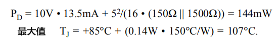 作为最坏情况的例子,使用图1电路中的OPA635(SOT23-6封装)计算最大TJ,该电路在最高规定环境温度+85°C下运行,并在中等供电条件下驱动150Ω负载。