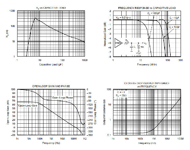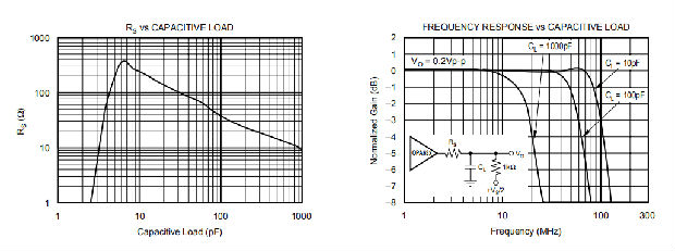 设置RS电阻器的标准是负载处的最大带宽、平坦频率响应。当增益为+2时,输出引脚处的频率响应在没有电容性负载的情况下已经稍微达到峰值,需要相对较高的RS值来平坦负载下的响应。增加噪声增益也会减少峰值(见图4)。