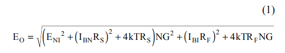 总输出斑点噪声电压可以计算为所有平方输出噪声电压贡献者和的平方根。方程1显示了使用图6中所示术语的输出噪声电压的一般形式: