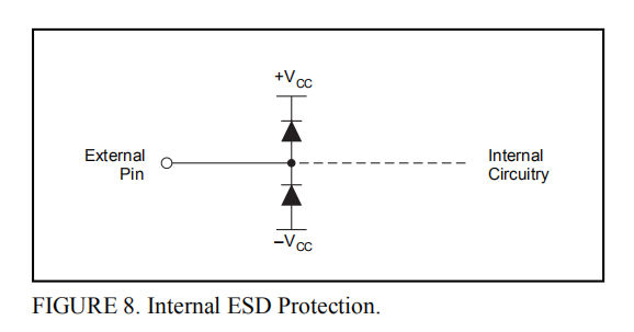 OPA634和OPA635是使用非常高速的互补双极工艺制造的。对于这些非常小的几何器件,内部结击穿电压相对较低。这些细分反映在绝对最大评级表中。所有的设备引脚都用内部的ESD保护二极管保护电源,如图8所示。