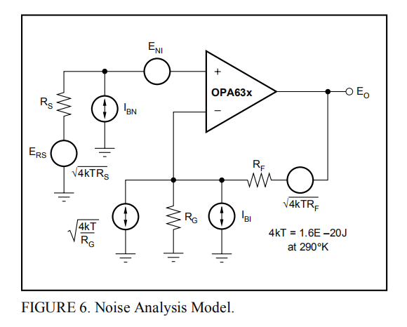 高转换率,单位增益稳定,电压反馈运算放大器通常以较高的转换率为代价输入噪声电压。然而,OPA634和OPA635的5.6nV/√Hz输入电压噪声远低于同类放大器。输入参考电压噪声,两个输入参考电流噪声项(2.8pA/√Hz),在各种工作条件下都能提供低输出噪声。图6显示了包含所有噪声项的运算放大器噪声分析模型。在这个模型中,所有的噪声项都被认为是噪声电压或电流密度项,单位为nV/√Hz或pA/√Hz。
