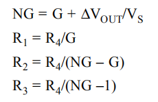 首页电路就是这种应用的一个很好的例子。当使用+3V电源时,它被设计为在0V和0.5V之间获取VIN,并在1V和2V之间产生VOUT。这意味着G=2.00,且∆VOUT=1.50V–G•0.25V=1.00V。插入上述方程(R4=750Ω)得到:NG=2.33,R1=375Ω,R2=2.25kΩ,R3=563Ω。电阻器被改为最接近的标准值。