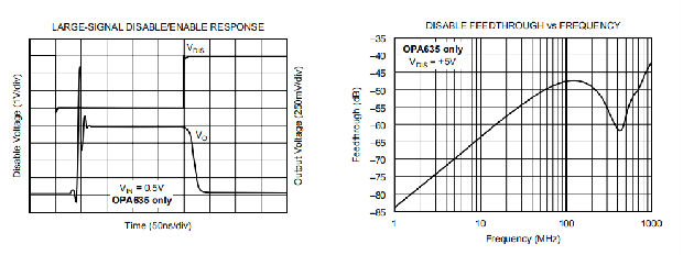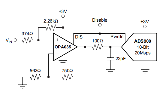 低5.6nV输入电压噪声支持宽动态范围操作。使用OPA635高速禁用线路可实现多路复用或系统功率降低。通过将禁用线设为高,可以将功耗降低到零。