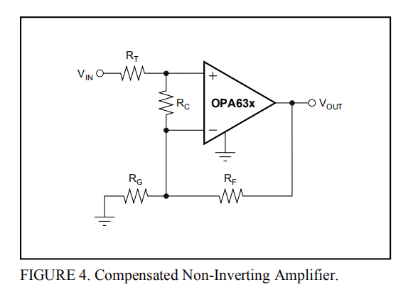 图4显示了一个非反相放大器,它可以降低低增益时的峰值。电阻器RC补偿OPA634或OPA635以获得更高的噪声增益(NG),从而在不改变直流增益的情况下降低交流响应峰值(在G=+1时通常为5dB,无RC)。VIN必须是低阻抗源,例如运算放大器。电阻值较低,以减少噪音。同时使用RT和RF有助于最小化寄生阻抗的影响。