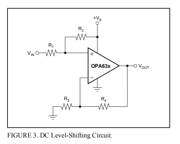 图3显示了一个直流耦合的非逆变放大器,它将输入电平向上移动,以适应所需的输出电压范围。给定所需的信号增益(G),并且当VIN在其范围的中心时,需要将VOUT量上移(∆VOUT),以下方程式给出了产生所需性能的电阻值。首先将R4设置在200Ω和1.5kΩ之间。