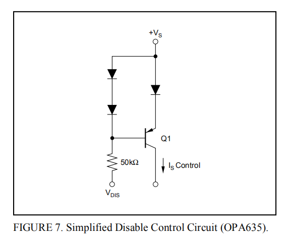 OPA635提供了一个禁用特性,可用于降低系统功率或实现简单的信道复用操作。要禁用,控制引脚必须断言为高。图7显示了禁用控制功能的简化内部电路。