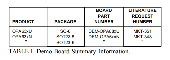 有两块PC板可用于在三种封装样式中使用OPA634和OPA635来帮助对电路性能进行初步评估。这些都是免费的,作为一个不受欢迎的个人电脑板提供的描述性文件。这些电路板的汇总信息见表一。