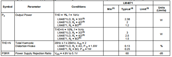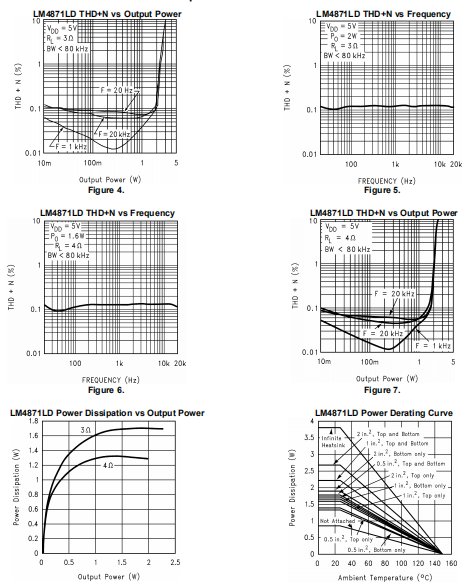 (5) 当从5V电源驱动3Ω或4Ω负载时,LM4871LD必须安装在电路板上。