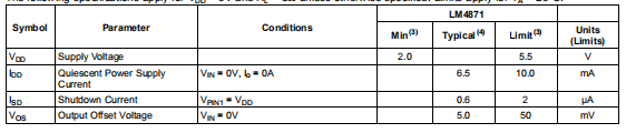 (3) 最大功耗必须在高温下降低,并由TJMAX、θJA和环境温度决定助教。最大允许功耗为PDMAX=(TJMAX–TA)/θJA或绝对最大额定值中给定的数值,以两者为准是比较低的。对于LM4871,TJMAX=150°C。对于不同包装的θJA,请参阅应用信息部分或绝对最大额定值部分。