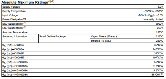 (1) 绝对最大额定值表示设备可能发生损坏的极限值。工作额定值表示设备可以正常工作,但不能保证特定的性能限制。电气特性状态直流和交流电气确保特定性能极限的特定试验条件下的规范。这假设设备位于运行额定值。对于没有给出限制的参数,不能保证规格,但是,典型值是一个很好的指示设备性能。