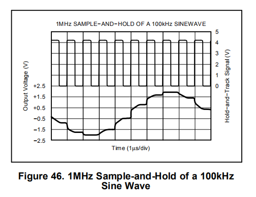 为了说明如何在图45电路中实现数字化,图46显示了以1MHz的速率采样的100kHz正弦波。这里使用的输出信号是驱动50Ω负载的IOUT输出。