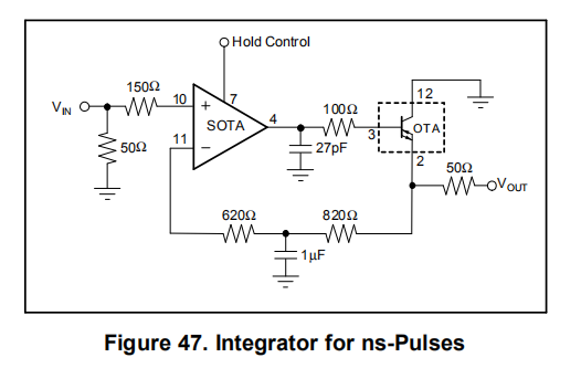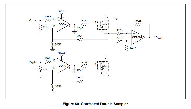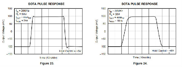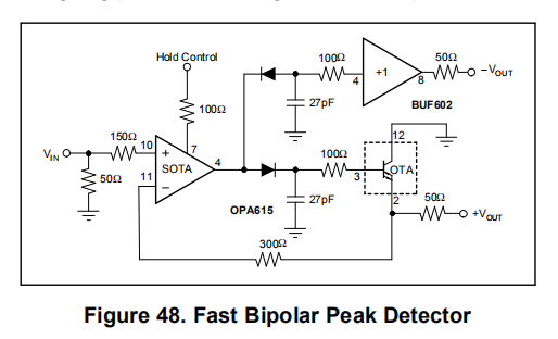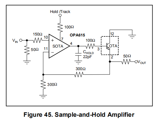 OPA615的控制传输延迟为2.5ns,带宽为730MHz,可用于高速采样保持放大器。图45说明了这种配置。