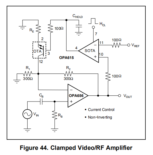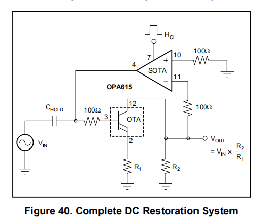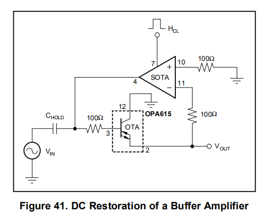 OPA615包含一个宽带运算跨导放大器(OTA)和一个快速采样比较器(SOTA),它代表了一个完整的子系统,用于非常快速和精确的直流恢复、偏移箝位和对GND或可调参考电压的校正,以及宽带运算放大器或缓冲放大器的低频嗡嗡声抑制。