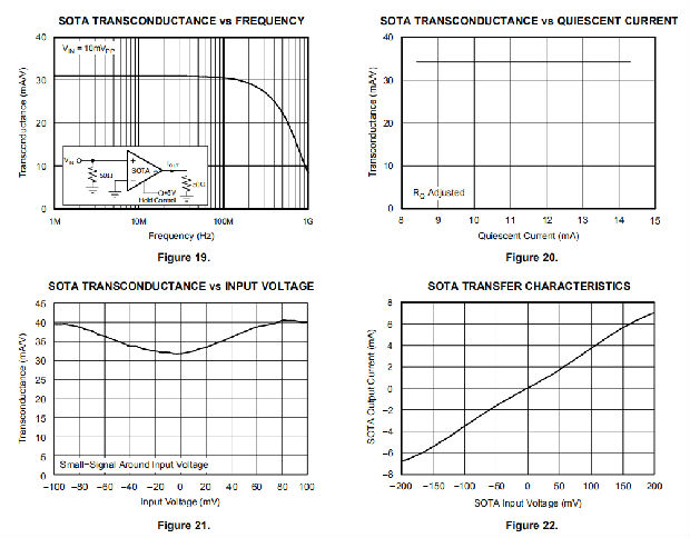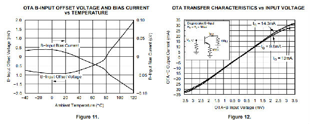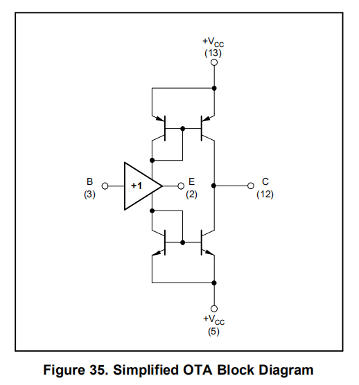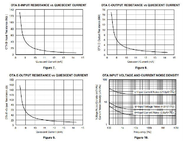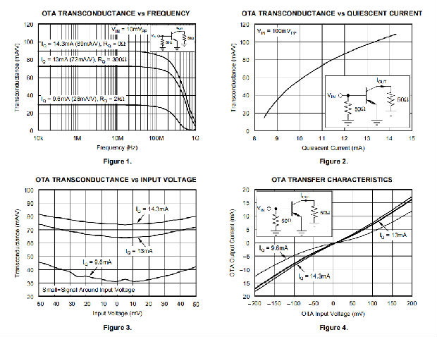 虽然OTA功能和标记看起来与晶体管相似,但它提供了本质上的区别和改进:1)对于正的B-to-E输入电压,集电极电流从C端子流出;对于负电压,集电极电流流入C端子;2) 公共发射极放大器在非反相模式下工作,而公共基极在反相模式下工作;3)OTA的线性度远高于双极晶体管;4)跨导可通过外部电阻器调节;5)由于PTAT偏压特性,静态电流增加,如典型性能曲线所示随温度变化,并保持交流性能恒定;6)OTA为自偏压双极性;7)零差输入电压下,输出电流约为零。以零为中心的交流输入产生以零为中心的输出电流。