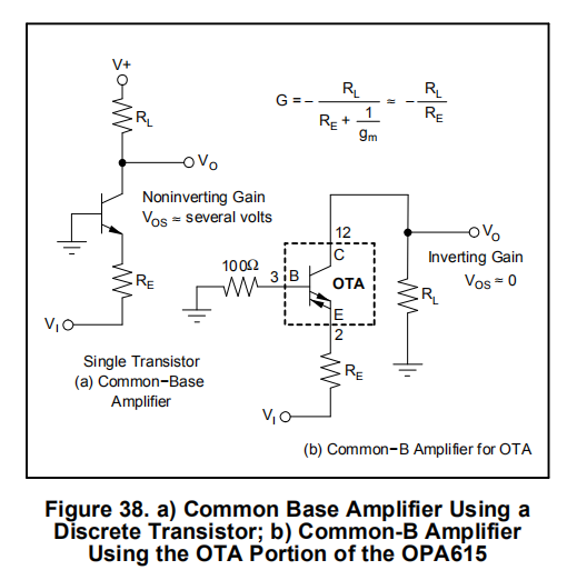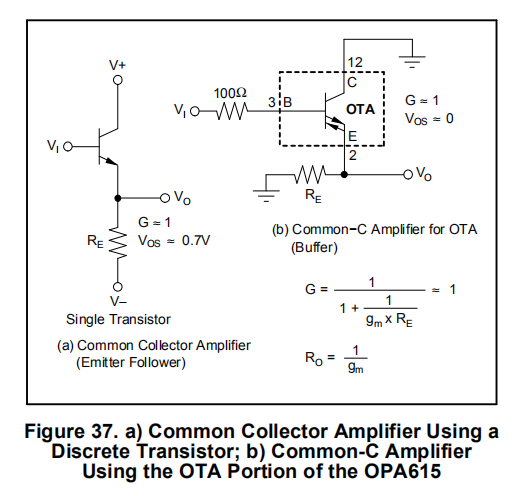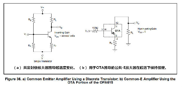 大多数用于OTA部分的应用电路由一些基本类型组成,这些类型通过类比离散晶体管电路得到了最好的理解。正如晶体管有三种基本工作模式:共发射极、公共基极和公共集电极,OTA也有三种等效的工作模式:com mon-E、common-B和common-C(见图36、图37和图38)。图36显示了作为公共发射极晶体管放大器连接的OTA。输入和输出可接地参考,无任何偏压。放大器是不可逆的,因为从发射极流出的电流也会从集电极流出,这是图35所示的电流镜的结果。