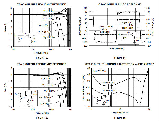 RE电阻器可由相对较大的电容器旁路,以保持较高的交流增益。RE和这个大电容器的并联组合形成了一个高通滤波器,提高了高频增益。其他在某些情况下,可能需要RC补偿网络与RE并联工作,以优化高频响应。在发射端测得的大信号带宽(VO=1.4VPP)达到770MHz。集电极的频率响应与集电极与接地之间的电阻值直接相关;它随着电阻值的增加而减小,这是由于OTA C输出电容形成的低通滤波器。