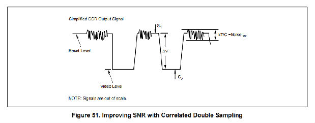 双采样技术也降低了白噪声。白噪声是复位电压(VRESET)和视频幅度(VRESET–VVIDEO)的一部分。在假设第二个样本的噪声与第一个样本的噪声没有变化的情况下,噪声放大率为纬度是相同的,并且在时间上是相关的。因此,CDS功能可以降低噪声。