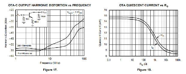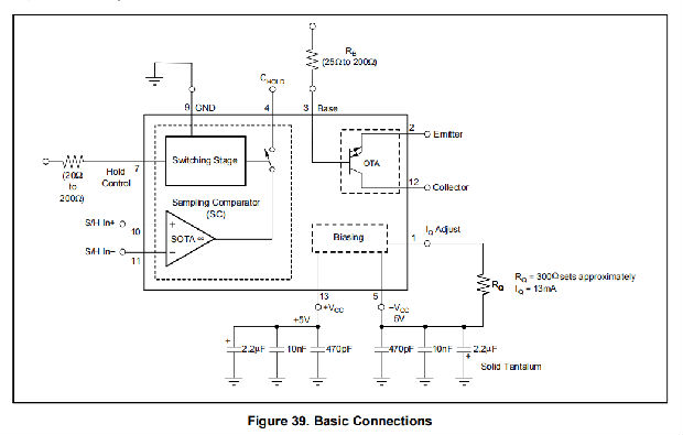 SO-14封装上的外部电阻RQ允许用户设置静态电流。RQ从引脚1(IQ调整)连接到–VCC。它决定了OTA部分的工作电流,控制OTA的带宽和交流行为以及跨导。