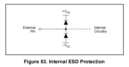 OPA615是使用非常高速,复杂的双极工艺制造的。对于这些非常小的几何器件,内部结击穿电压相对较低。这些故障反映在绝对最大额定值表中,其中报告了绝对最大±6.5V电源。所有设备引脚都有有限的ESD保护,使用interna二极管供电,如图53所示。