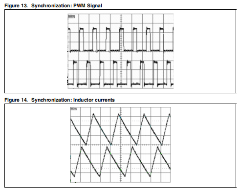 同一电路板上存在多个转换器会产生拍频噪声。到避免这种情况,重要的是使它们在相同的开关频率下工作。此外,a不同模块之间的相移有助于使公共输入上的均方根电流最小化电容器。图13和图14显示了两个模块同步的结果。二或者更多的设备可以通过连接同步管脚来同步。设备开关频率越高,主开关频率越高,主开关频率越高,主开关频率越高,开关频率越高,主开关频率越高,主开关频率越高。这个从控制器将增加开关频率,按比例减小斜坡幅度从而提高调制器的增益。
