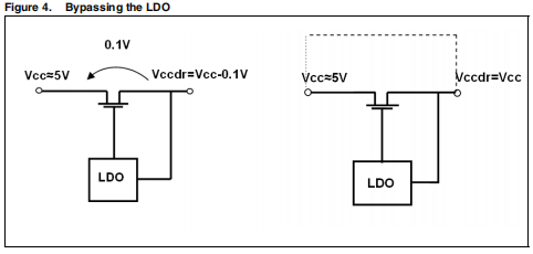 如果VCC≈5V,则内部LDO工作在压降状态,输出电阻约为1Ω。这个最大LDO输出电流约为100mA,因此输出电压降为100mV避免这种情况,可以绕过LDO。