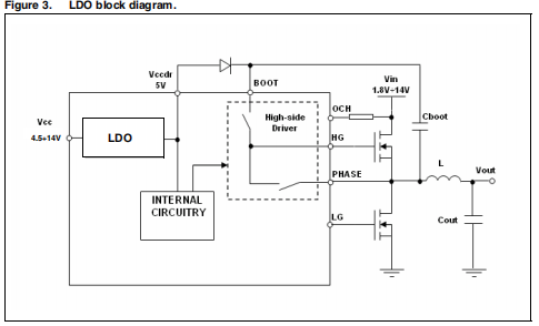 内部LDO为设备的内部电路供电。这个阶段的输入是VCC引脚和输出(5V)是VCCDR引脚(图3)。