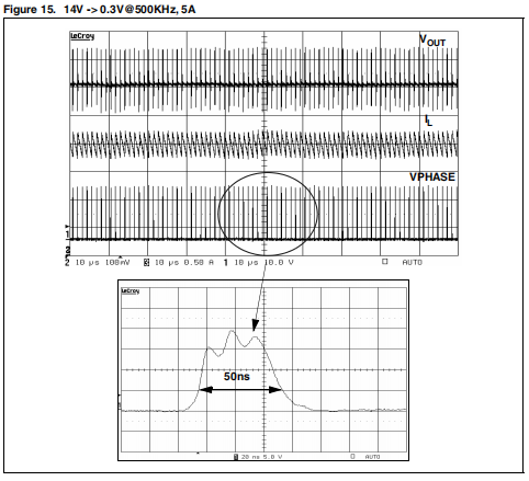 该设备可以管理小于100ns的最小接通时间。这个功能来自从L6732的特殊过流保护系统的控制拓扑结构出发。事实上,在电压模式控制器中,不需要感应电流来执行调节,并且在L6732的情况下,既不适用于过流保护,又考虑到在断电期间谷电流保护可在任何情况下运行。与此功能相关的第一个优势是实现极低转化率的可能性。图15显示了从500KHz时为14V至0.3V,吨约为50ns。