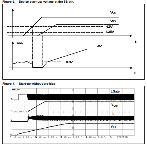 当VCC和VIN均高于其开启阈值时(VIN由OCH引脚监控)启动阶段开始。否则SS引脚内部对地短路。启动时,a斜坡是通过内部电流发生器给外部电容器CSS充电而产生的。这个该电流的初始值为35μA,对电容器充电至0.5V。之后10μA,直到最终充电值约为4V(见图6)。错误的输出放大器用这个电压(VSS)夹紧,直到达到编程值。禁止切换如果VSS低于0.5V并且两个mosfet都关闭,则可以观察到活动。当VSS为在0.1V和1.5V之间的场效应管是低信号所以占空比为0%。当VSS达到1.1V时(即振荡器三角波下限)即使高边MOSFET开始开关和输出电压开始增加。L6732只能在软启动阶段提供电流为了管理预偏压启动应用程序。这意味着当启动发生时当电压大于0.5V时,Vss输出电压大于0.5V1.1V低侧MOSFET保持关闭(见图7和图8)。