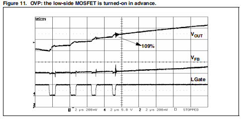 必须考虑到在输出端子和FB引脚,因此引脚上的电压不是输出电压的完美复制品。然而,由于转换器可以吸收电流,在大多数情况下低侧会在输出电压超过过电压阈值之前导通,因为错误放大器会提前失去平衡。即使设备没有报告过电压行为是一样的,因为低侧是立即打开的。下图显示过电压事件期间的设备行为。输出电压呈斜率上升以这种方式模拟高压MOSFET的断开作为过电压因为。