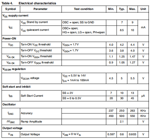 该控制器是在BCD5(BiCMOS DMOS,版本5)制造中实现的集成电路为高性能降压DC-DC和niPOL转换器。它被设计用来驱动同步整流buck拓扑中的N沟道mosfet。这个变换器的输出电压可精确调节至600毫伏,最大公差为±0.8%,也可以使用0伏至2.5伏的外部基准。输入电压范围为1.8V至14V,而电源电压的范围为4.5V至14V。高峰值电流门驱动器提供快速切换到外部电源部分,以及输出电流可以超过20A。PWM占空比可以在0%到100%之间最小接通时间(吨,分钟)低于100纳秒,可实现非常低的转换高开关频率下的占空比。该设备提供电压模式控制,包括可选频率振荡器(250KHz或500KHz)。误差放大器具有10MHz的增益带宽乘积和5V/μs的转换率,允许实现高带宽的快速瞬态响应。设备监控电流通过使用高侧和低侧MOSFET的RDS(ON),消除了对电流感应电阻,并保证在所有应用条件。必要时,两个不同的限流保护可以是外部的通过两个外部电阻器设置。在软启动阶段,在软启动后,提供恒流保护过流时装置进入卡阻模式。在软启动期间,sink模式该功能被禁用,以便在预偏压输出电压下也能正常启动条件。软启动后,设备可以吸收电流。其他功能都很好,主从同步(180°相移),过压保护,反馈断开和热关机。HTSSOP16包允许实现紧凑型DC/DC转换器。
