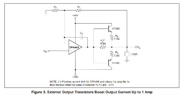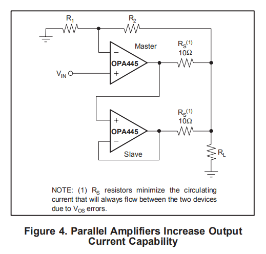 在15mA输出电流不足以驱动所需负载的应用中,可通过并联两个或多个OPA445来增加输出电流,如图4所示。放大器A1是主放大器,可以配置在几乎任何运算放大器电路中。从放大器A2被配置为单位增益缓冲器。或者,可以使用外部输出晶体管来提高输出电流。图5中的电路能够提供高达1A的输出电流。