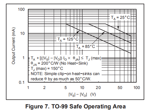输出晶体管上的应力由输出电流和导电输出晶体管的输出电压VS−VO决定。输出晶体管消耗的功率等于输出电流和穿过导电晶体管的电压的乘积,VS−VO。安全操作区(SOA曲线,图6至图10)说明了电压和电流的允许范围。所示曲线表示焊接到印刷电路板(PCB)上的无散热片的设备。增加印刷电路迹线面积或使用散热片(TO-99封装)可显著降低热阻(),从而在给定输出电压下增加输出电流(参见图11、图12和散热片部分)。