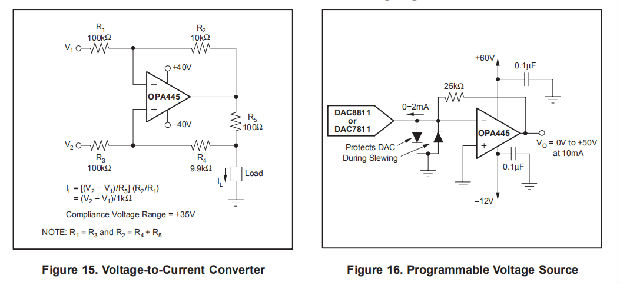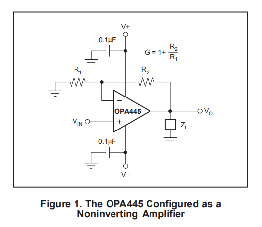图1显示了OPA445作为基本的非转换放大器连接。OPA445几乎可以用于任何运算放大器配置。