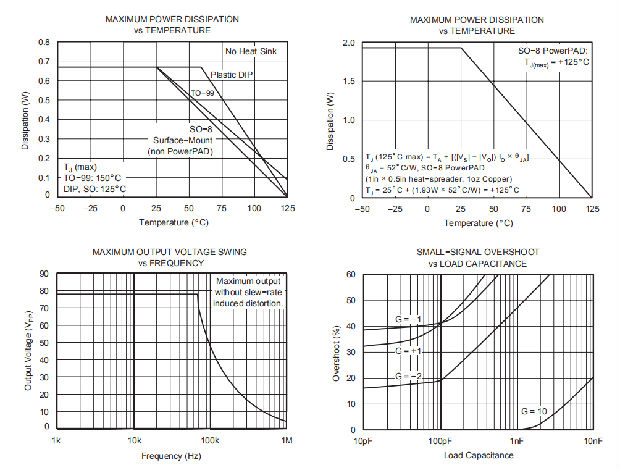 对于电阻负载,最大功耗发生在电源电压一半的直流输出电压。交流信号的损耗更低。应用公告SBOA022解释了如何计算或测量异常负载或信号的耗散。