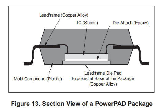 PowerPAD封装的设计使得引线框架模具垫(或热垫)暴露在IC底部;见图13。这种设计在模具和封装外部之间提供了一个极低的热阻(JC)路径。IC底部的热垫可以直接焊接到PCB上,使用PCB作为散热片。此外,电镀通孔(过孔)为PCB背面提供了一条低热阻热流道。