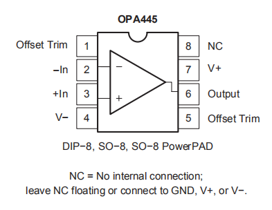 OPA445提供标准引脚TO-99、DIP-8和SO-8表面安装封装以及用于降低结温的SO-8 PowerPAD封装。它完全规定在−25°C到+85°C之间,在−55°C到+125°C之间工作。SPICE宏模型可用于设计分析。